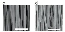 图2 有序尼龙纳米纤维膜修饰前(左),后(右)电镜照片