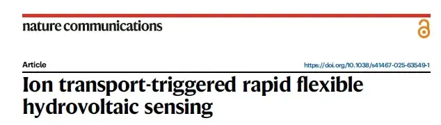 中国科学技术大学纳米技术与纳米仿生学院(苏州纳米所)张珽团队再发文章“Ion transport-triggered rapid flexible hydrovoltaic sensing”,该文章成功发表于国际综合性顶级期刊《Nature Communications》(2024年影响因子为14.7。中科院分区:综合类1区TOP)