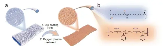 (1)通过高速静电纺丝获得的NNF(尼龙-66纳米纤维膜)经CPS(羧基化聚苯乙烯)浸涂及氧等离子体处理后(图1),表面羧基含量显著提升,Zeta电位增强至约-50 mV,XPS和FTIR表征进一步证明了C=O和-OH等含氧官能团的增加,显著增强了界面结合力和表面极性。