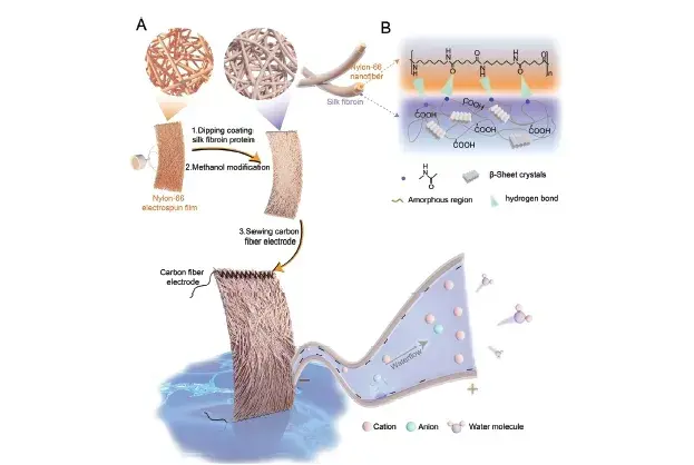 本研究提出了以静电纺丝尼龙纳米纤维膜为核心的水伏离子传感新策略。通过静电纺丝技术制备具有300纳米通道尺寸的尼龙膜,并结合丝素蛋白精准调控纤维膜通道尺寸以及表面化学特性,实现了纳米通道离子选择性增强与水伏电压响应提升。