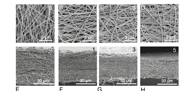 图2 浸涂丝素蛋白不同次数(0,1,3,5次)的尼龙66纳米纤维膜电镜图