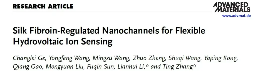 中国科学技术大学纳米技术与纳米仿生学院(苏州纳米所)张珽团队的文章“Silk Fibroin-Regulated Nanochannels for Flexible Hydrovoltaic Ion Sensing”,成功发表于材料科学领域国际顶级期刊《Advanced Materials》(2024 年影响因子 27.4,中科院 1 区 TOP)。这一突破性研究中,云帆静电纺丝机(YFSP-T)作为核心制备设备,为高性能柔性水伏离子传感器的研发提供了关键技术支撑。