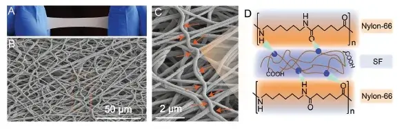 由于丝素蛋白中存在大量的酰胺和羧基官能团,尼龙-66纳米纤维可以与其形成大量氢键,实现异质界面的稳定性提升(图3)。同时,强极性的羧基官能团也有效地增加了水伏薄膜的表面电位(从-18 mV增加到-46 mV)。